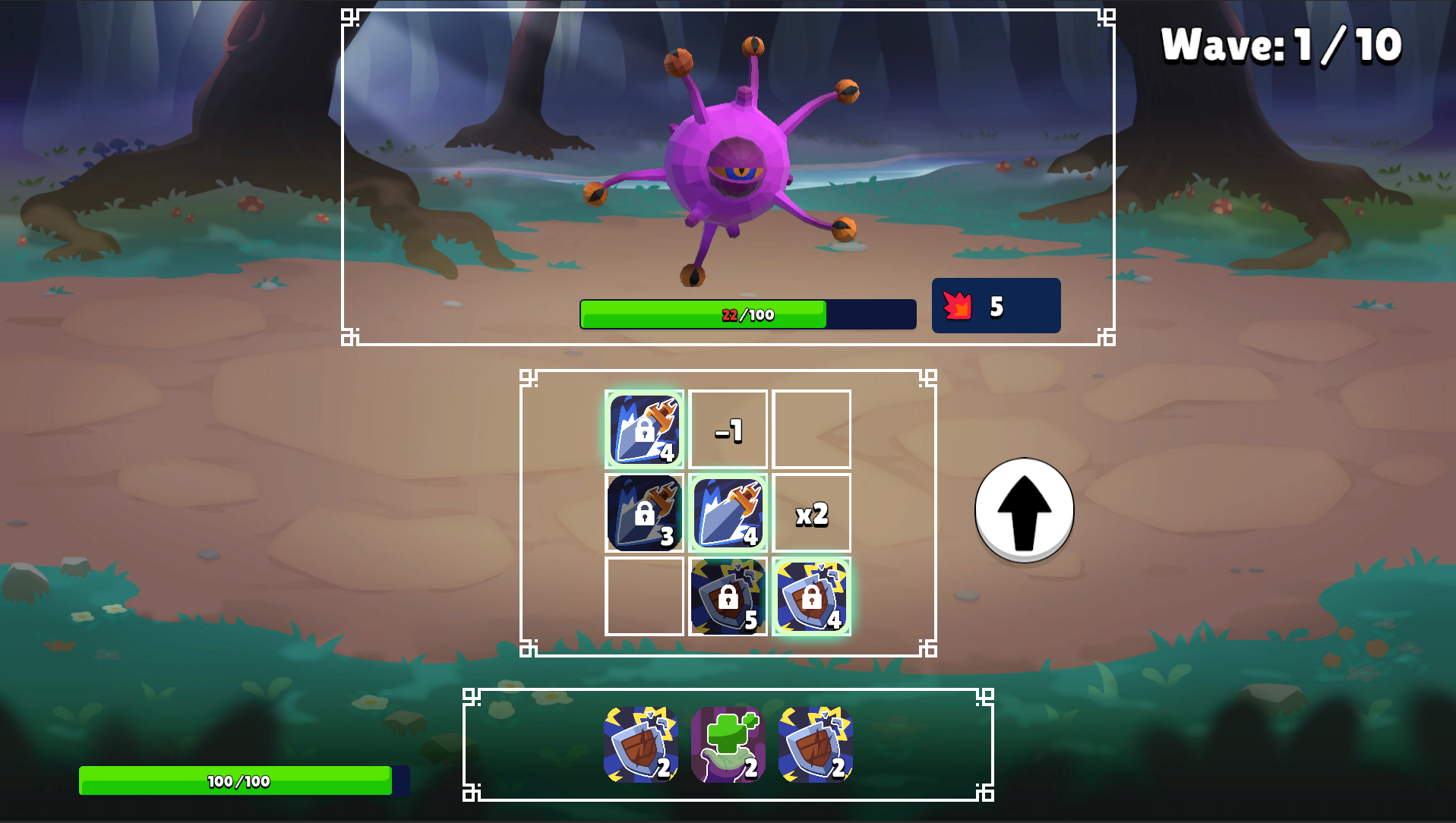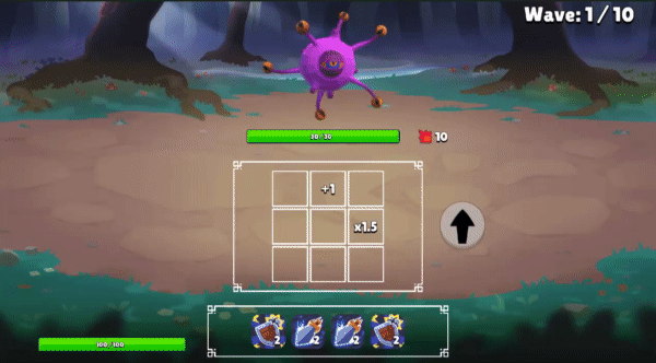 - Place cards onto a 3x3 bingo board. Different spaces on the board have multiplier abilities that enhance the cards. Achieving a line triggers the card abilities; unconnected cards are saved for the next turn.
